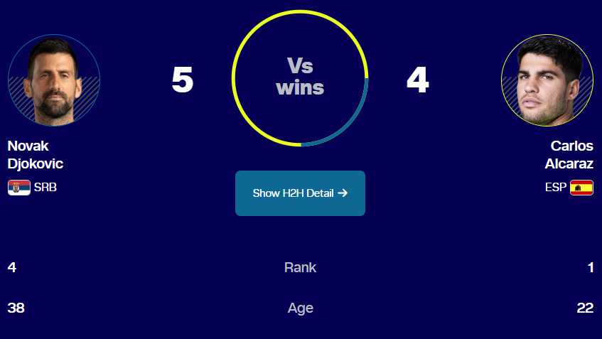 Это противостояние Карлоса Алькараса и Новака Джоковича станет юбилейным 10-м. Пока что со счетом 5:4 ведет серб. Причем он же ведет в личных встречах, проведенных на харде (3:1).